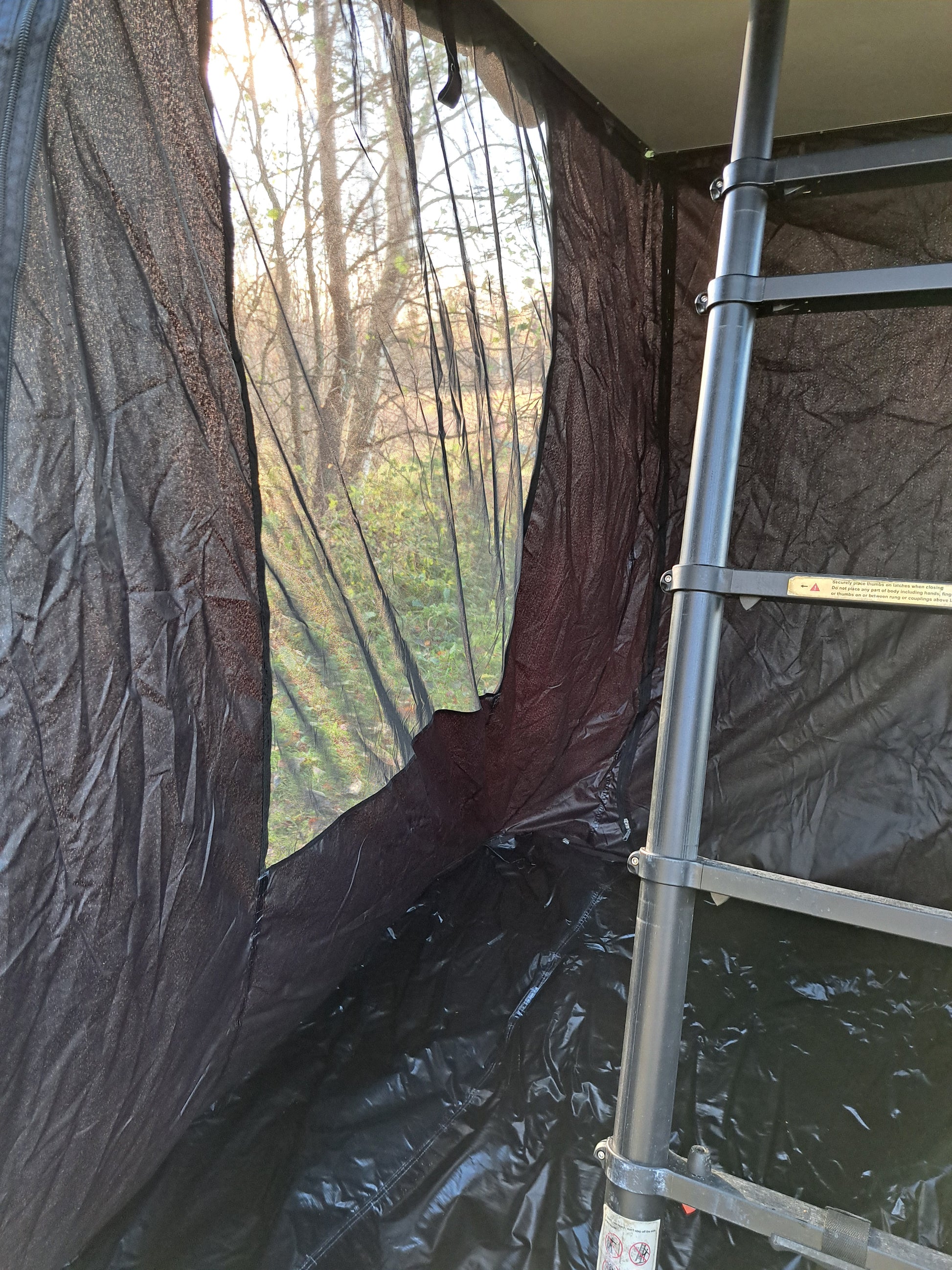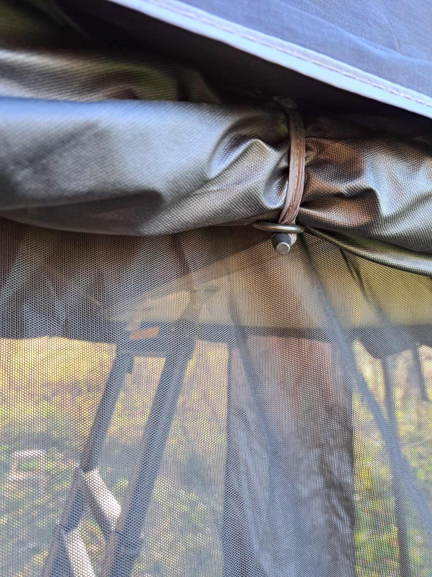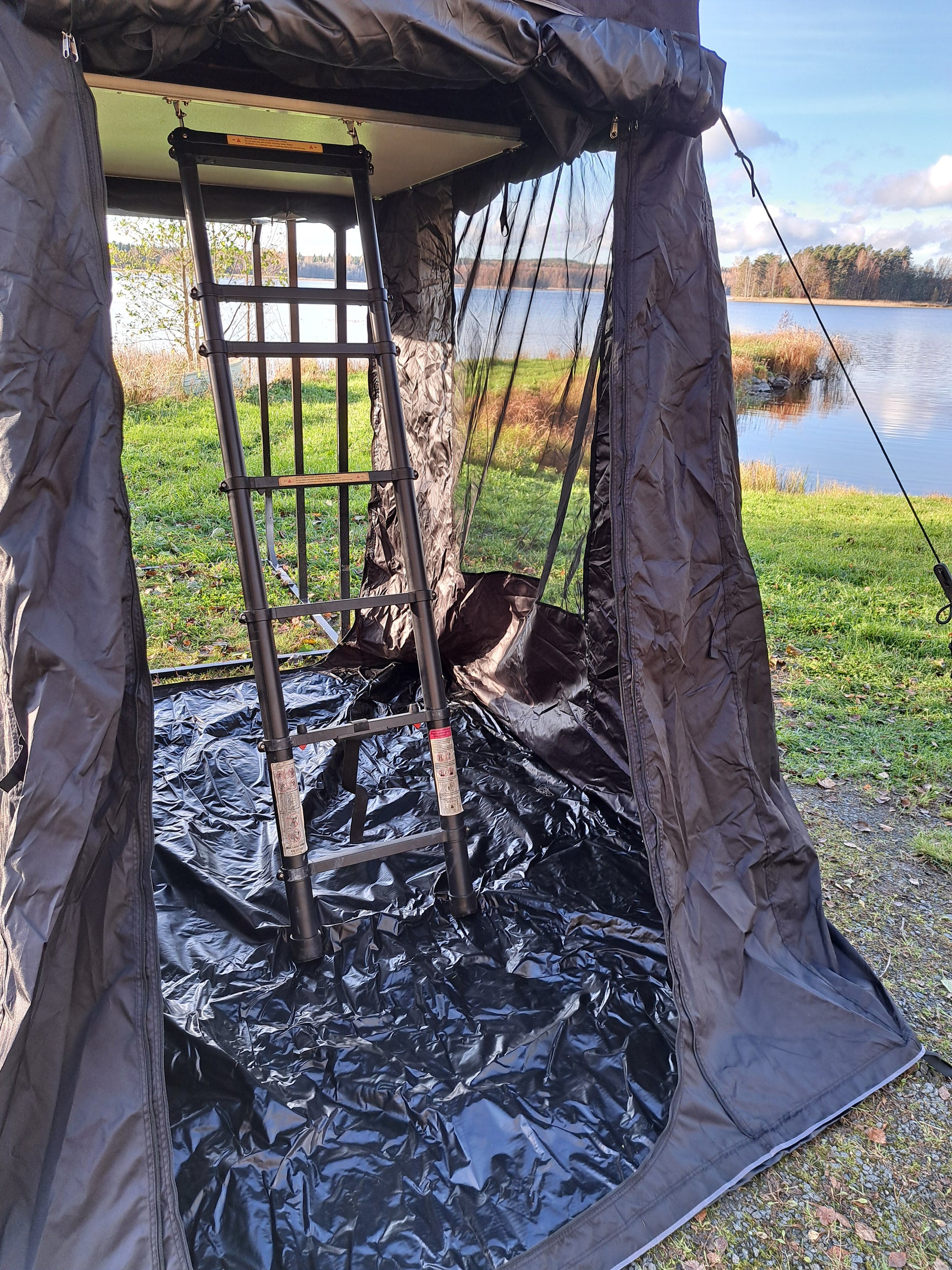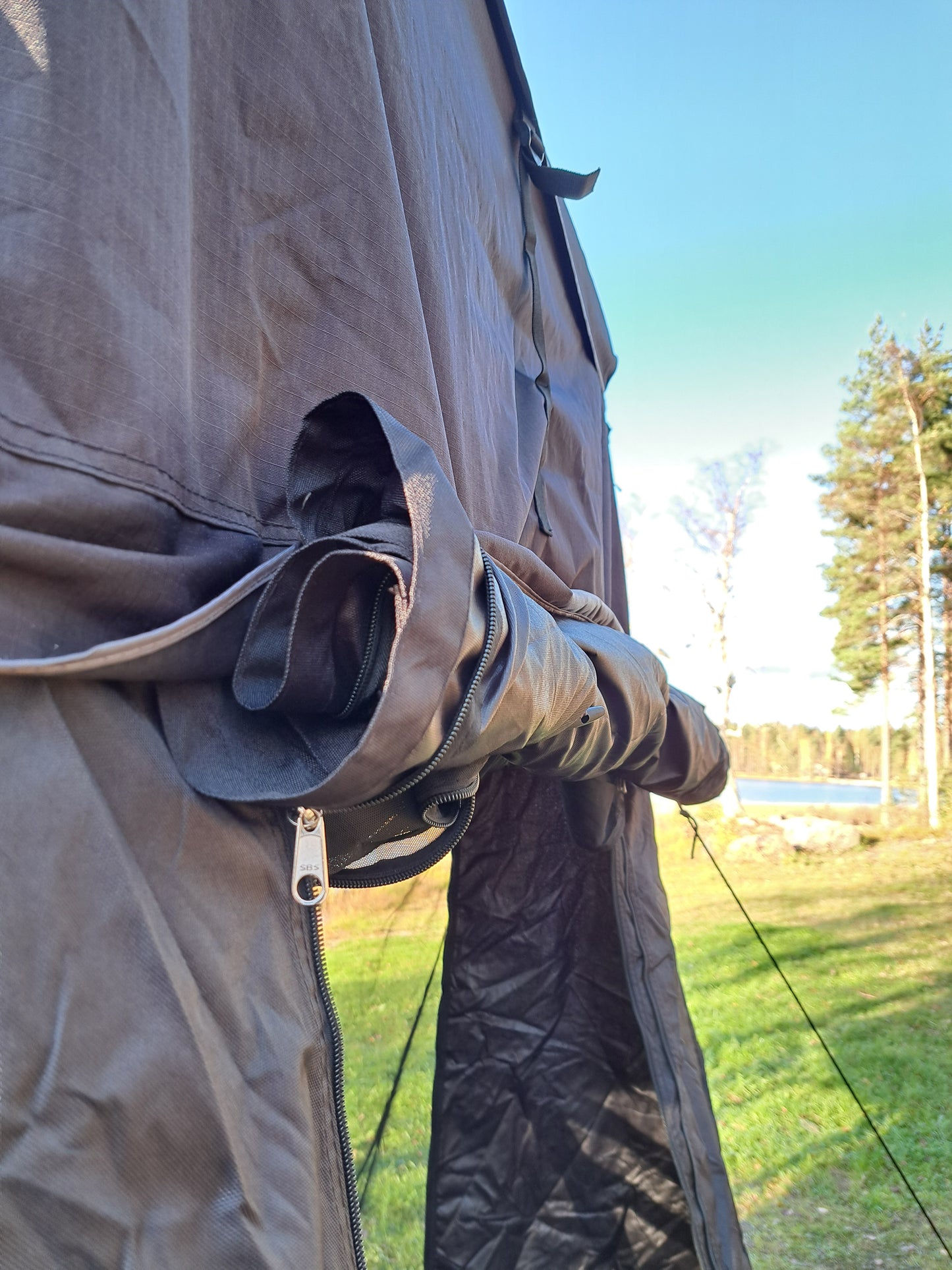 -Kulkuaukko edessä hyttyverkolla ja sade-/näkösuojalla.