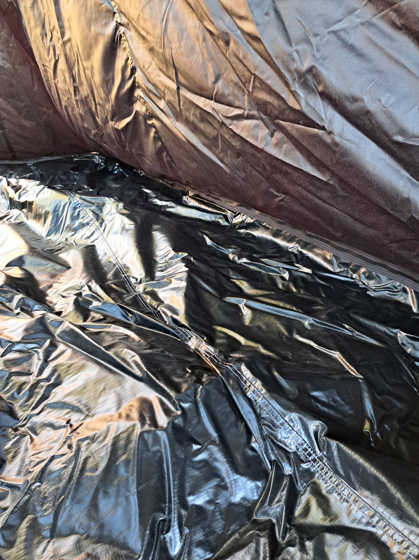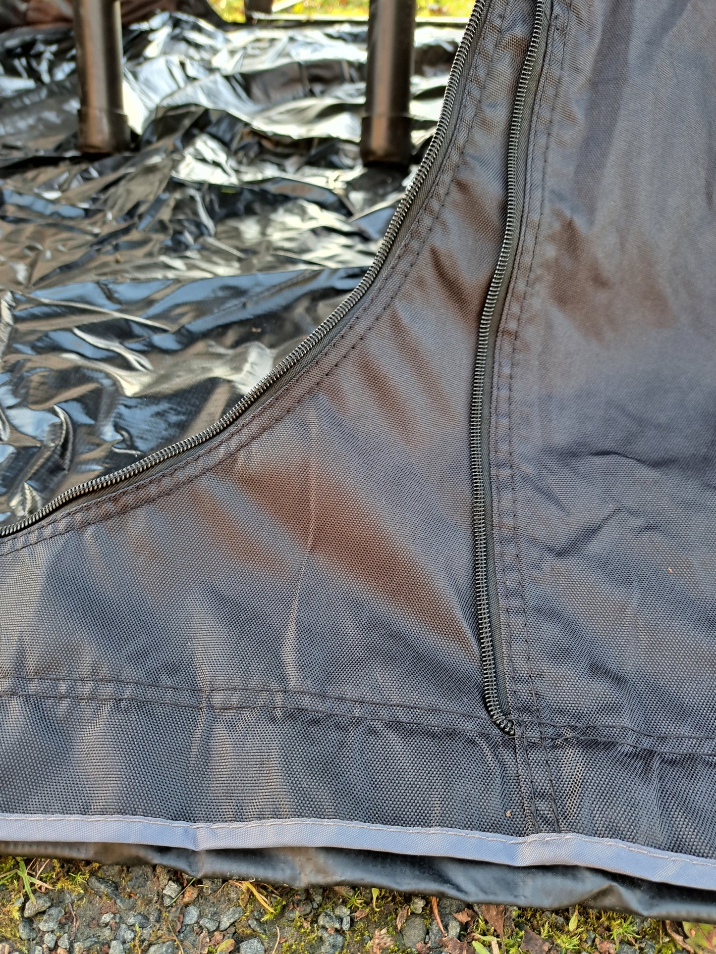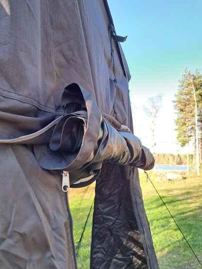 -Sivuilla kiinteät hyttysverkot vetoketjulla suljettavilla sade- / näkösuojilla.